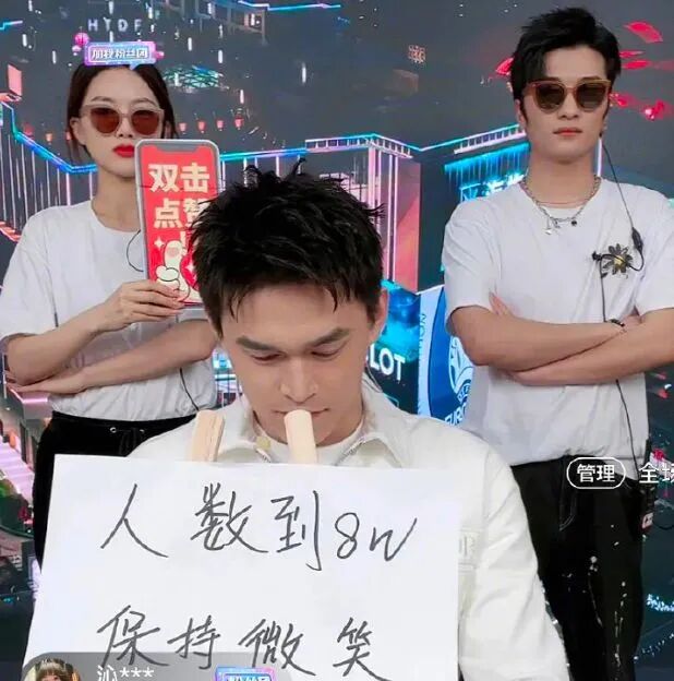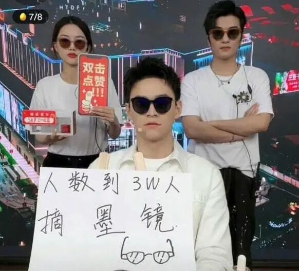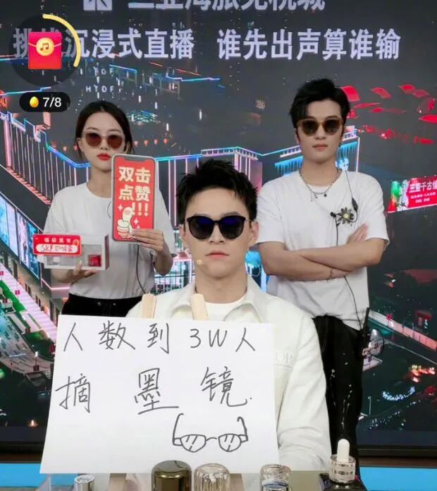 点进孙杨的直播间会发现,团队在大屏上打出了“挑战沉浸式直播,谁先出声算谁输”的标语,孙杨面前的纸上也不断变换互动条件,其中就包括:人数到3万就摘墨镜、到5万笑一下,到8万保持微笑和到10万才说话。