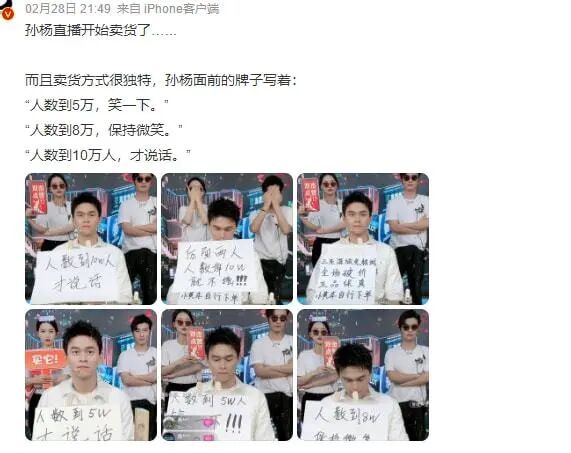 看着这样不按常规出牌的直播,孙杨的直播间很快超过了3万人,紧接着,孙杨前面又换了一块牌子,人气破5万,孙杨就会对直播间的网友笑一下。