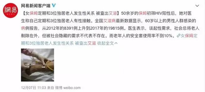 无独有偶,前一段时间,也有新闻报道,一名50岁保姆被查出艾滋病,原因是她在照顾三名独居老人,不仅给他们买菜做饭做家务,还要陪他们定期睡觉。