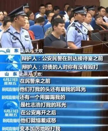 “有人扣住我的脖子,把我强行拉回招待室,我不愿意走,他们就打我”,回忆起当时的画面,于欢的声音像被压了千斤坠般沉重,他没能反抗成功,最终被强行拉回招待室。