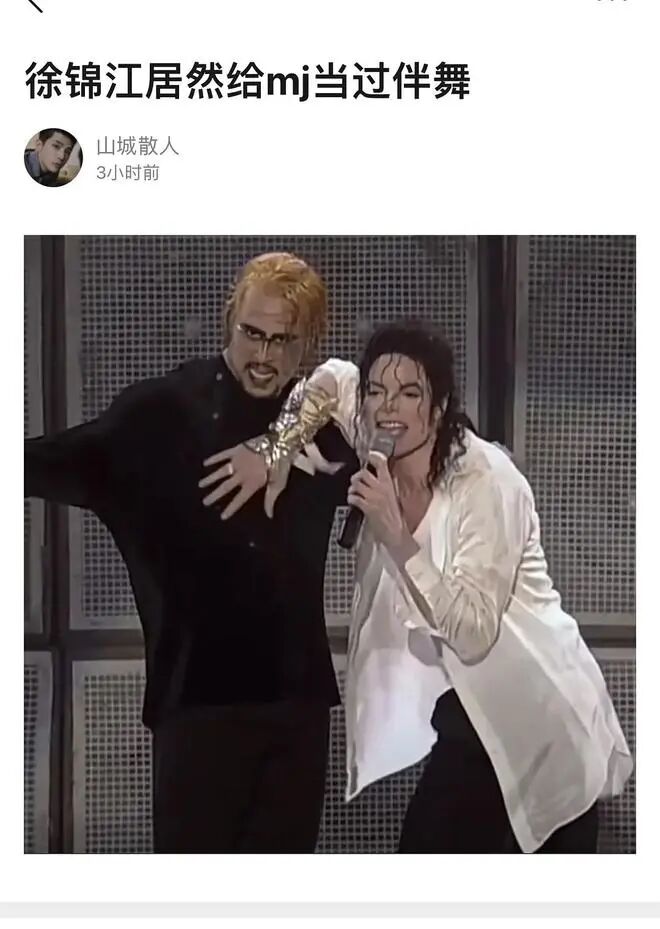一些迈克尔杰克逊的粉丝在看他的演唱会视频时,偶然发现一个伴舞格外面熟,再加上金毛狮王的发型,越看越像徐锦江,当然口说无凭,有网友就放出了视频截图,话说,迈克尔·杰克逊身后的那名舞伴,身高气质和徐锦江非常相符。