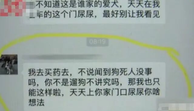 姜大哥说,之前有人在小区业主群里发过一张截图,曾经引起过狗主人的恐慌。在这张截图中,有一个人在群里说,也不知道这是谁家的爱犬,天天在我上车的这个门尿尿,最好别让我看见。而更可怕的是下面一个人的回复,他说我去买药去,不说闻到狗死人没事儿吗?