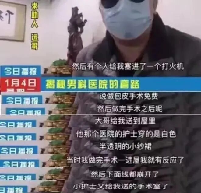 后来,远先生在接受采访时说:“大夫把我推进屋里,我当时就懵了,这个医院的小护士跟一般医院的护士不一样,都穿着半透明的白色小纱裙,里面是比基尼,而且一个个的都老漂亮了。我当时刚做完手术,一下子就有反应了,然后下面的线崩开了,老疼了!然后小护士又把我推回了手术室……”
