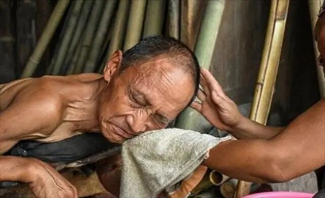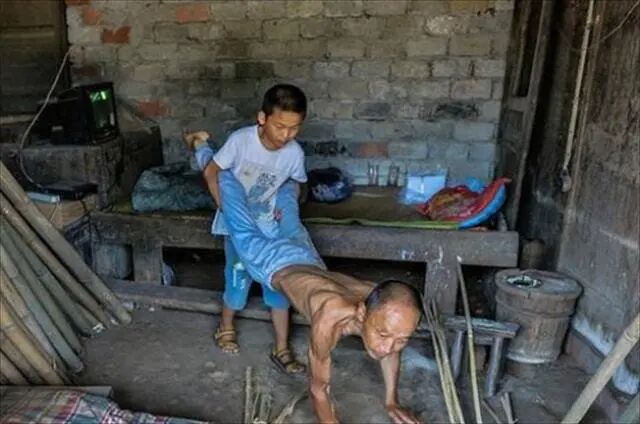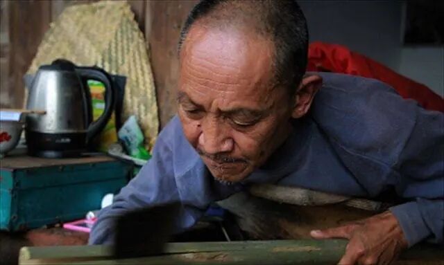 由于无法像正常人一样坐起来,他就让妻子将自己抱到门槛边,在门槛上垫一块板子,用以支撑他瘦小的身躯。