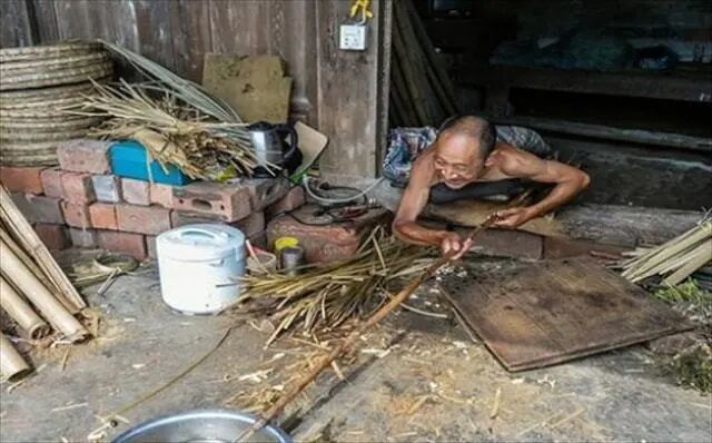 几十年如一日,李佰洲每天坚持趴在门槛上编竹器。