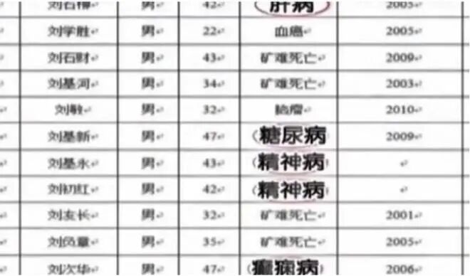 而且,根据他们去世的原因做归类,其中只有七个人得了癌症,四人死于煤矿事故,两个在外地出了意外,还有几个是因为精神类疾病,意外摔倒离开的,剩下的都是正常去世。