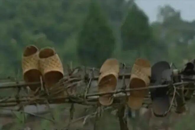 在竹篱笆围栏的进出口处,还整齐地摆放着两双筒靴,筒靴非常旧,打了多处补丁。