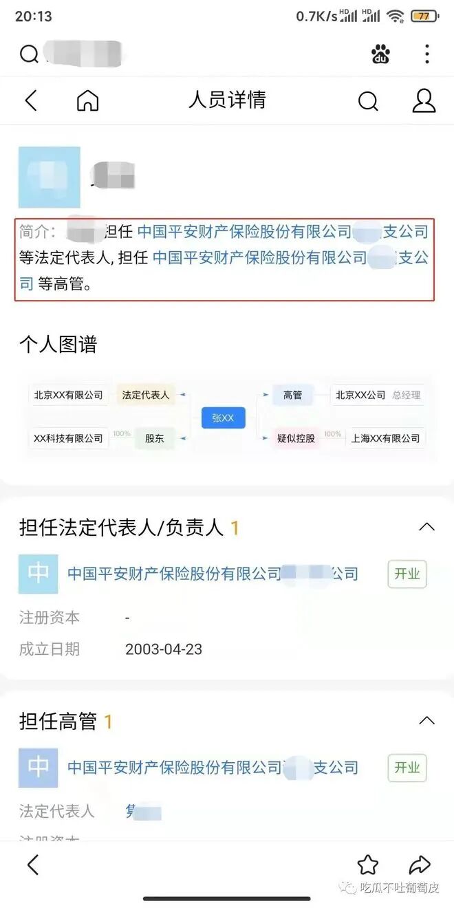 天眼查显示该男子担任中国平安财产保险股份有限公司某分公司法定代表人。
