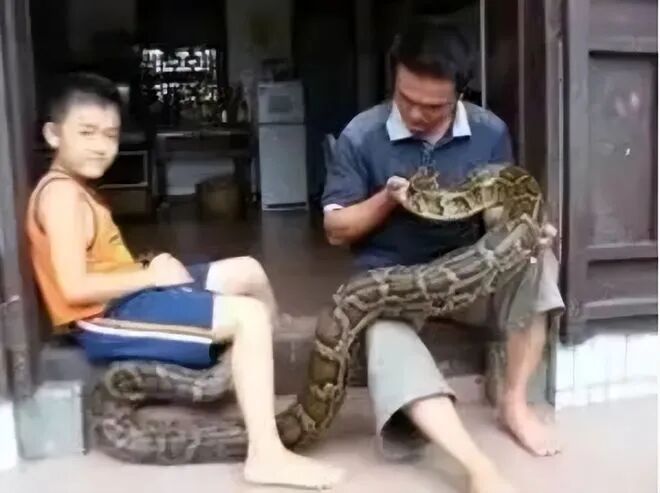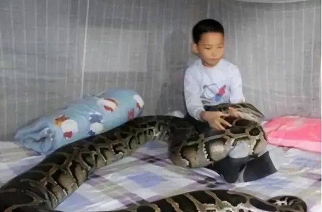 黄家人养着一条巨蟒,男主人把它视作自己的兄弟,每次家中大人外出的时候,还把蟒蛇独自留在家中照顾孩子,为其看家护院。