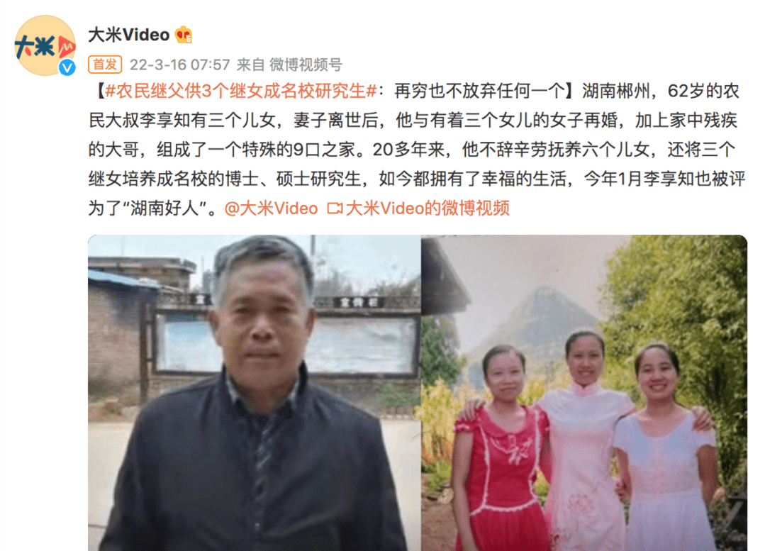 他的事迹被更多的人知晓:他靠12亩地供出了3个研究生,但这三个孩子并不是他亲生的,都是他的第二任妻子带来的继女。