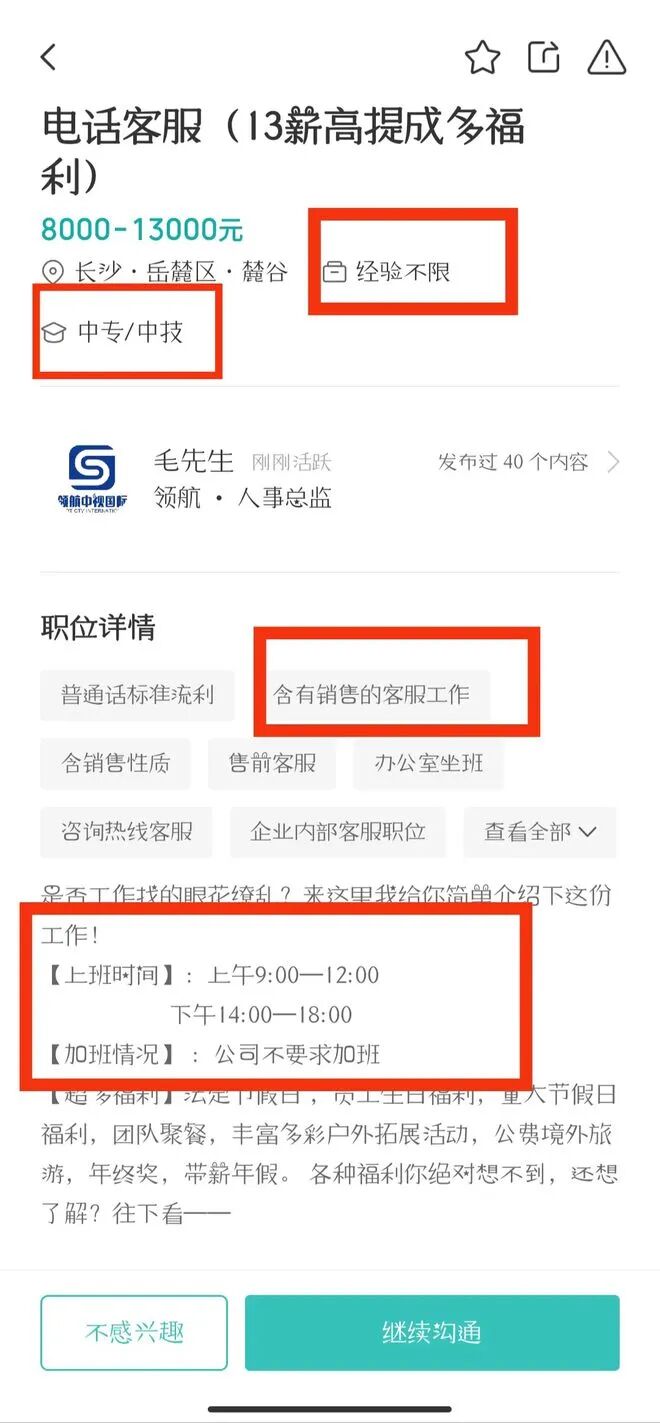 “至今没搞明白,对方为什么要辱骂我。”记者了解到,黄先生所应聘的岗位显示为电话客服,要求大专学历,经验不限,薪资待遇在8000-13000元之间,黄先生称,他的条件也都符合对方的招聘要求,“可能是我回复反驳了他的一些话,所以才对我有这么大的恶意。”