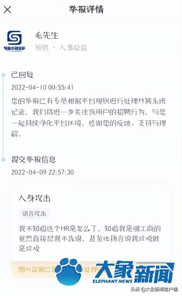 4月11日,湖南网友黄先生向大象新闻爆料,他在BOSS直聘应聘某岗位时,遭到了平台HR的恶意辱骂。