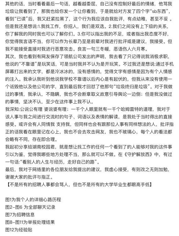 其次,我也看到有网友保存了领航公司发出的声明,我去看了只记得说我消极求职,他说的‘不靠谱’是玩笑话,可是当时我并不认为是开玩笑。不过我还是想说:通过手机屏幕打出来的文字,都是冷冰冰的,没有感情的,觉得文字有感情是因为有个人情感的注入。我承认我听到他说我学校不靠谱以后内心是有起伏的,但我从来没有使用一个诋毁他以及他公司的字,直到最后我才回怼了他那句‘垃圾终归是垃圾’。对于我做过的事情,我承认,不隐瞒,我也不会断章取义故意引导舆论一边倒;但是我没做过的事情,坚决不认,至少在这件事上我不认。”