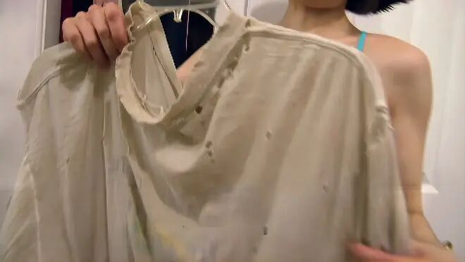 向朋友们展示着自己衣柜里破破烂烂的衣物。