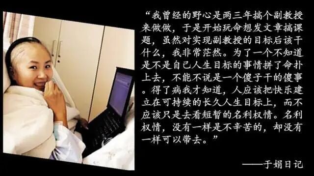 “在生死临界点的时候你会发现,任何的加班(长期熬夜等于慢性自杀),给自己太多的压力,买房买车的需求,这些都是浮云。”这便是于娟的答案。
