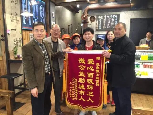 走进店里,你会被墙上各种相框所吸引。墙上挂着老板这一生的经历,有行走34个国家的主题,有带着老妈看世界各地的主题,有各种爱心公益活动的主题。墙上还挂着一面锦旗:爱心面暖环卫工人,微公益助城市人。你会为老板丰富的人生经历之丰富所震惊。