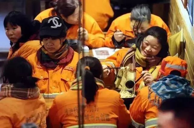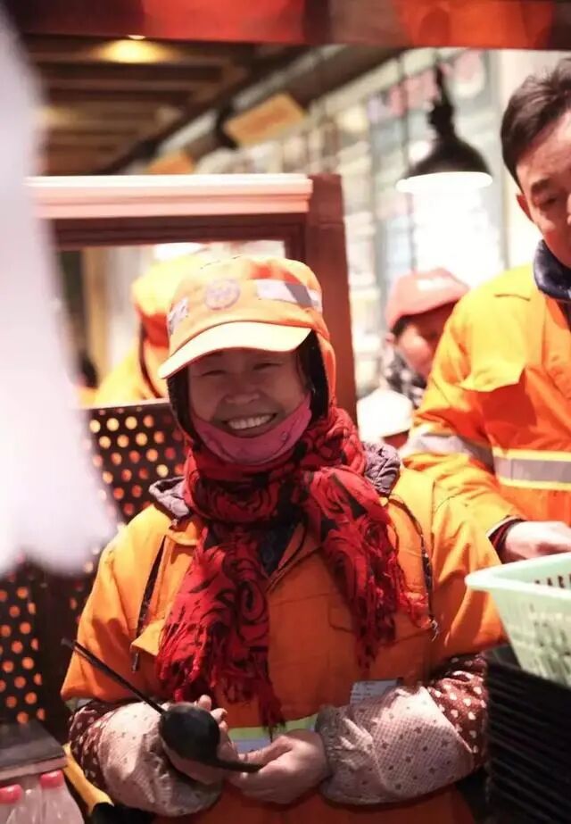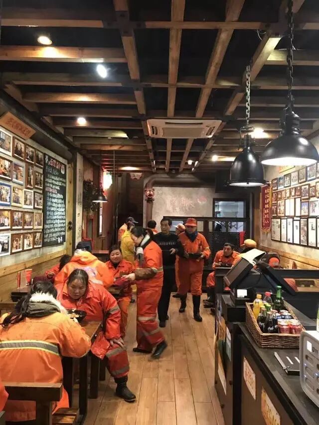 每天在用餐的时间,成良面馆门口会聚集一群穿橙色衣服的环卫工人,他们说说笑笑地在面馆前排队,形成了这条街上最亮丽的风景线。环卫工人的工作很辛苦,他们早上四点多就起来了,无论寒冬腊月还是烈日炎炎,他们都兢兢业业,一扫帚一扫帚扫出了整洁的市容。