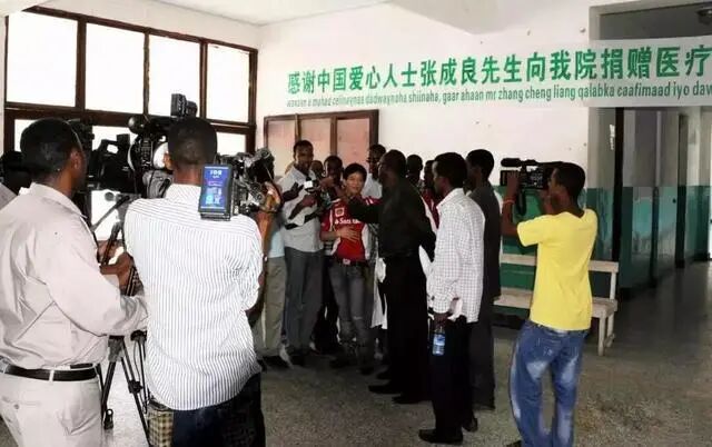 张成良在战地军队保护下给索马里一家当地医院——摩加迪沙公益医院送去了紧缺的医用制氧器和抗生素药品,还给当地的难民带去了自己几百桶奶粉和无数箱糖果以及日用品,希望能给当地人一些绵薄的帮助。