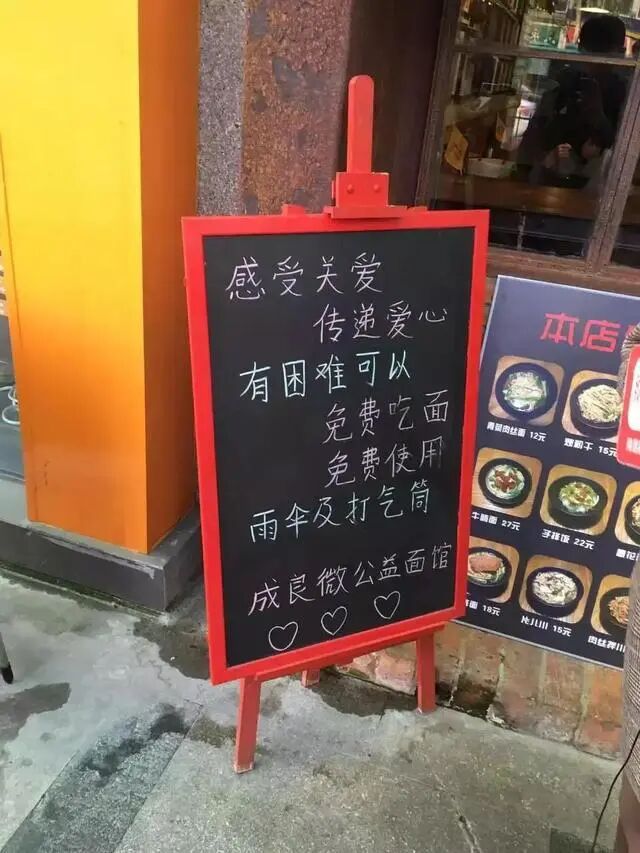 建国北路341号,一个深色的招牌上,几个绿色的大字赫然映入人们的眼帘——成良微公益面馆,下面印刷着“我有我味,杭州味”这七个字。门口一个黑底红框的小黑板上,用整齐的字迹写着:“感受关爱,传递爱心。有困难,可以免费吃面。免费使用雨伞及打气筒。”