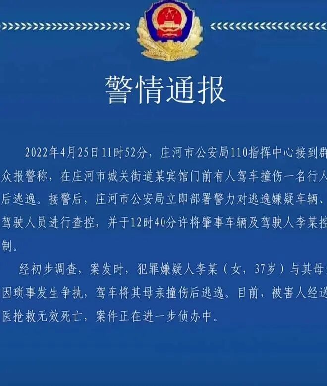 据大连警方通报,4月25日上午11时50分许,在辽宁省大连市庄河市黄海大街一家酒店附近,37岁的女子李某与其母亲因琐事发生争执,驾车将自己母亲撞伤后逃逸,李某的母亲经送医抢救无效死亡。目前,犯罪嫌疑人已被警方控制。
