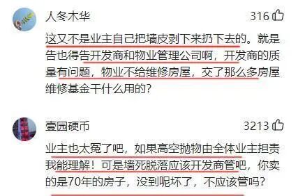 受害者被砸中身亡是不幸的,但是具体谁该赔偿应该搞清楚,不是业主将墙皮扔下去出的事,开发商和物业才是该负责的主体,要么是开发商交付的质量有问题,要么是物业没发现隐患没修缮,业主是交过小区维修基金的,不能什么事情都让业主背锅。