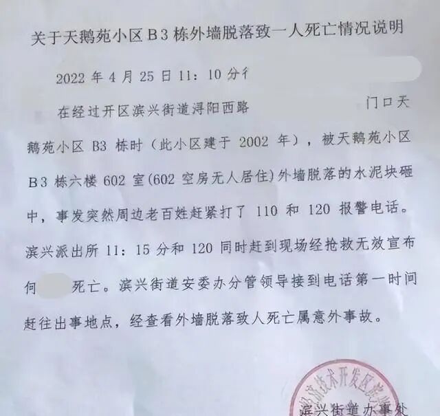 事故发生在一家足浴店门前,民警和急救车很快就赶了过来,但是女子已经没有了生命体征,九江市经开区街道之后出具了一份情况说明,称中午时分,一女子在天鹅苑小区附近被室外墙脱落的水泥块砸中身亡。