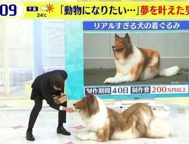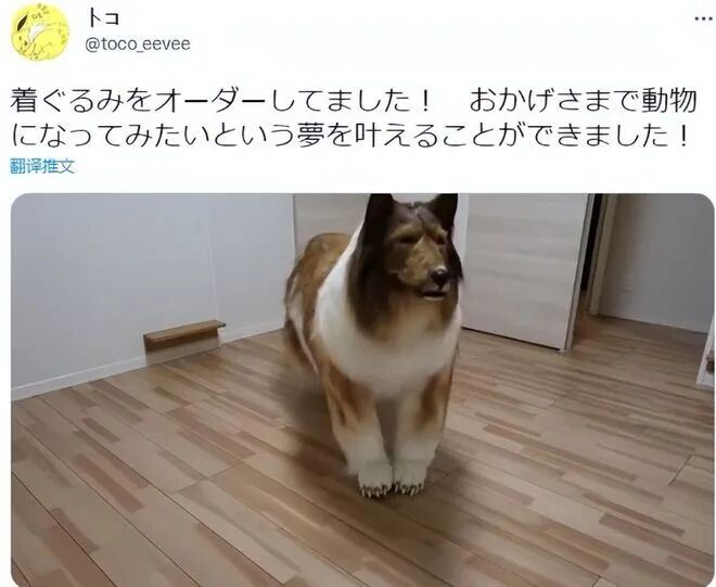 Toco,日本埼玉县人,30岁的他在几个月前联系到当地有名的特殊造型工作室,耗资200万日元(折合人民币10万元)的巨款以自己最喜欢的柯利犬为原型,下单定制了一套狗狗布偶装。在接受媒体采访时,Toco表示自己从小就喜欢上了猫狗这些四脚行走的动物,一直幻想着有一天自己也能成为其中一员。