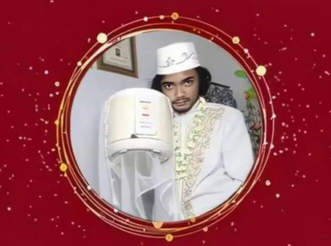 随后他竟真的选择和电饭煲结婚,专门从网上买来特制的白色头纱充当电饭煲的婚纱,又和电饭煲拍了婚纱照,举行了一场隆重的婚礼。然而谁也没想到就在结婚证还没捂热乎几天,弗罗兹.甘地又因为电饭煲不会说话而深感苦恼,最后还是忍痛离婚。