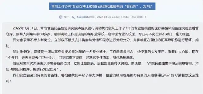 事情的肇始是当事人的爱人在网络上曝光的一个帖子。他在网络上发布了一条《青岛工作24年女博士被情形逼迫和威胁调离“看仓库”,对吗?》的帖子。从帖子当中,我们知道——