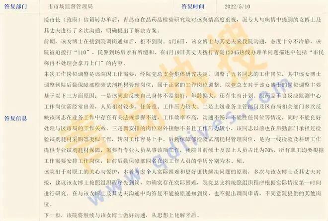 而正是因为女博士、专业岗位,取消职称竞聘、看仓库、职业学校校医这些关键词抓人眼球,很快这个帖子就被送上了当地的热搜。而迫于舆论的压力,当事单位才不情不愿地给了一个让人喷饭的回复——只要是看到回复的人,恐怕没有谁会不对女博士深表同情吧。我们来看一看青岛某研究院的回复。