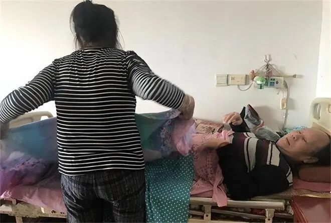 身材瘦小的她早早起床,端一大盆水,走到病床旁,试试温度合适之后,用温水为病床上的老人简单擦洗。
