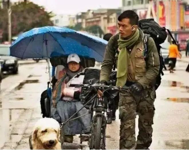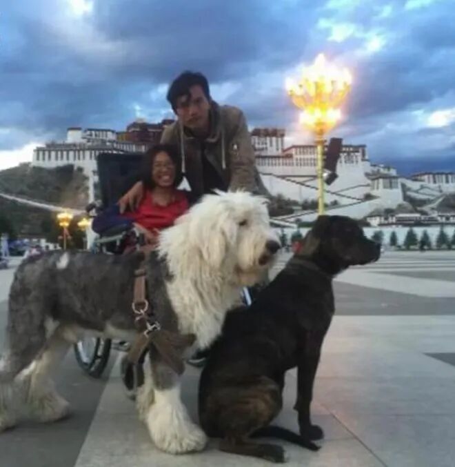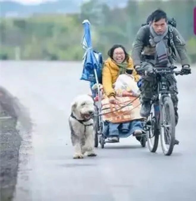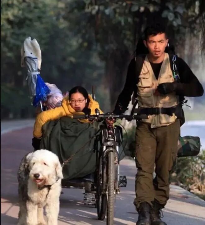 为了让赖敏旅游的时候方便,所以他还把自行车改装了一下,后面连接上女友的轮椅。除了自己的女朋友以外,丁一舟还带上了女友家的狗狗“阿宝”。