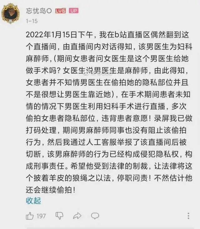 相关:麻醉师直播妇科手术被抓更多细节!女患者曾对他充满戒心!