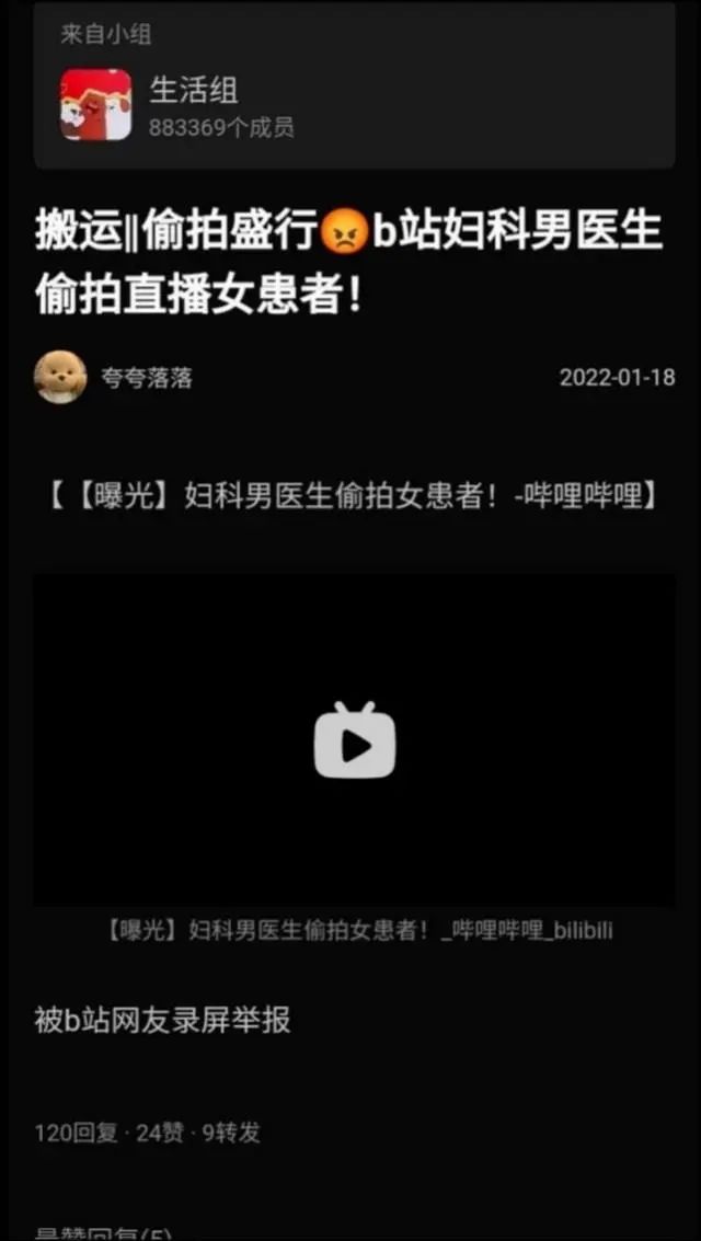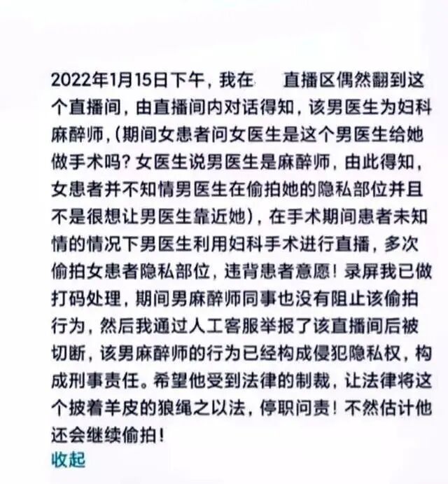 该网友称,在女患者妇科手术期间,男医生对女患者妇科手术进行直播,并多次偷拍女患者隐私部位。