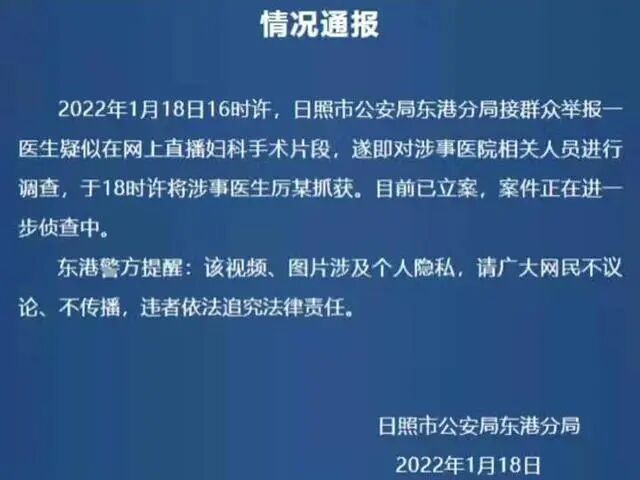 1月18日,警方对该医生直播妇科手术进行了警情通报: