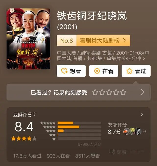 2001《铁齿铜牙纪晓岚》最新评分8.4