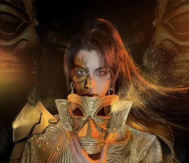2021年,小梦34岁,他以“面具成精”为主题推出三星堆文物,黄金面具仿妆。