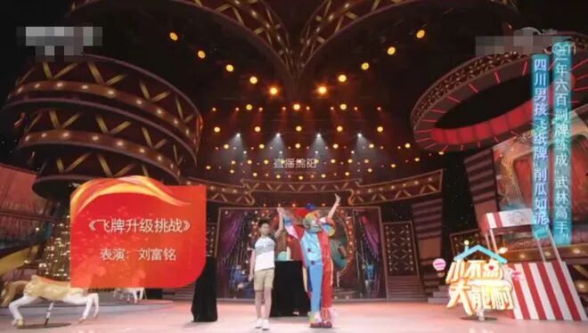 刘富铭在演播厅中表演了在两米外用纸牌削断黄瓜、香蕉、山药、西瓜,还再次击爆了易拉罐,让主持人和现场观众都惊讶得目瞪口呆。