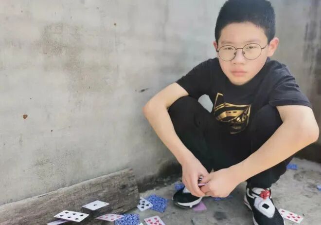 虽然失败了很多次,但是刘富铭却没有丧失信心,把地上散落的扑克牌捡起来之后又继续练习起来。