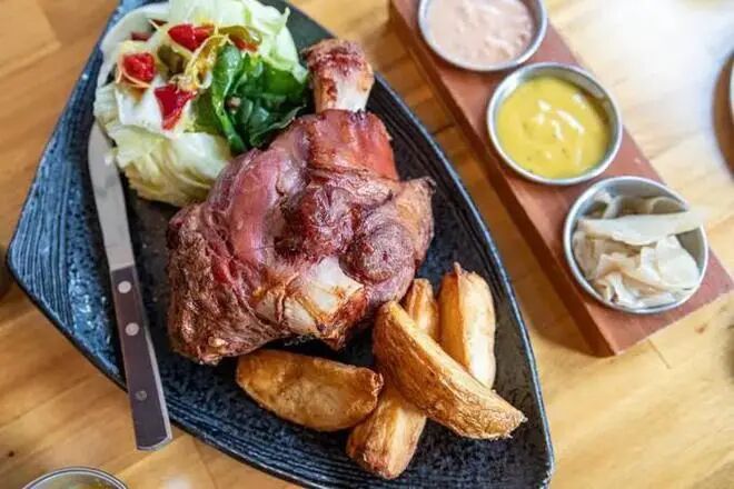 当时,导游给每名游客都发了一扎啤酒,还有一份猪肘餐,实际上就是一大块烧熟的猪肘子,搭配一些蔬菜沙拉。