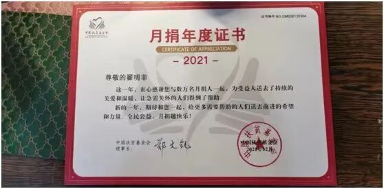 (翟明菲的捐赠证书)