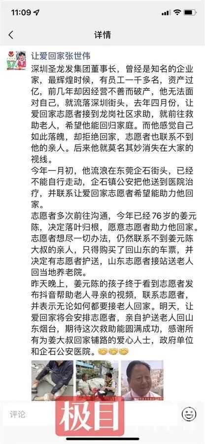张世伟介绍,2021年4月,志愿者就曾在街头发现姜元陈,希望能提供帮助。但姜元陈感觉自己如此落魄,拒绝回家。今年1月初,当地公安发现其在街头已经无法自行走动,便送其前往医院救治,同时也联系了志愿者。后姜元陈家人在抖音上看到了志愿者发布的寻亲视频,主动联系上志愿者,现家人已接老人回家。“只是破产后他要再去深圳打拼,家里人不同意,双方之间有点矛盾。姜大叔没有离婚,其家人也没有抛弃他。”张世伟说。