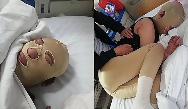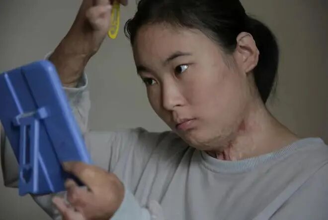 同时脸和脖子上全是伤疤,颈部和双手疤痕增生得严重,脖子僵硬得无法动弹。
