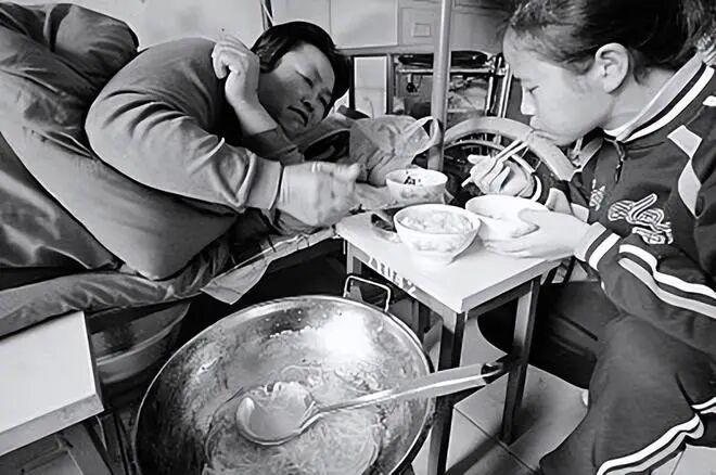 母亲不能吃硬食,因为吞咽功能下降,只能吃接近流食的食物,因此她每次给母亲买饭,都是买的稀饭或者流食。而她自己每日三餐就是馒头配咸菜,一直吃了整整一年。