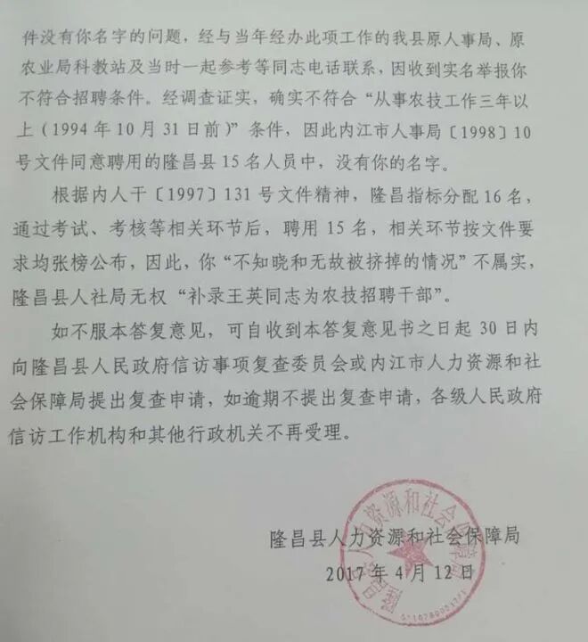 当时,隆昌县的相关部门进行了联合调查,发现王英确实不符合“工作三年以上”的条件,所以就没有录用她。