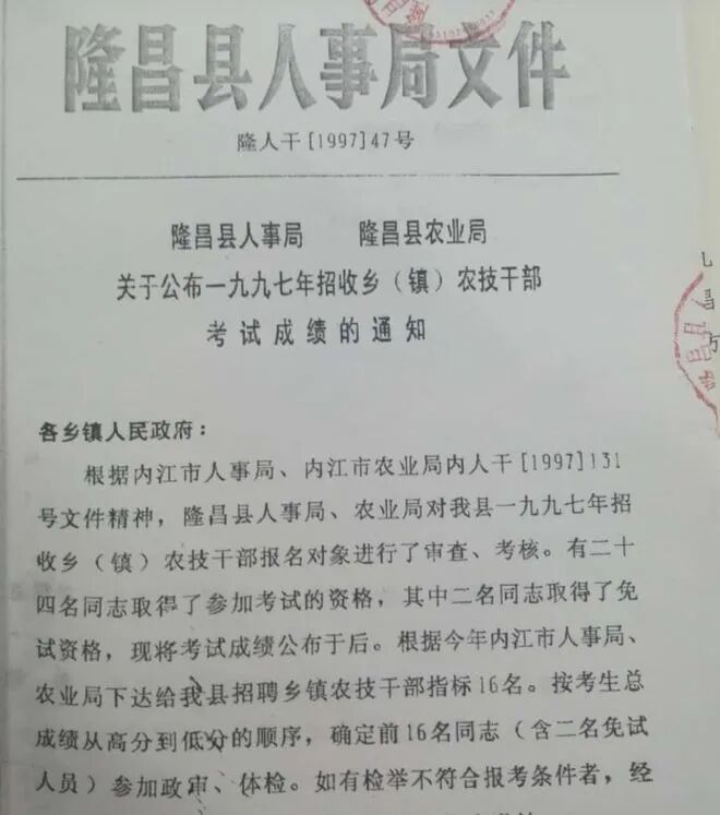1997年9月份的时候,隆昌县发布公告要招聘16名乡镇农技干部,考试时间就定在11月23日。