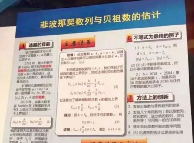 当然年龄最小的谈方琳也是有备而来,她在这次大赛之中展示了初三时的研究成果——斐波那契数列与贝祖数的估计。