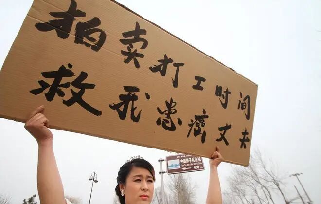 2017年4月,一位穿着婚纱,化着精致妆容的女子,站在了山东滨州孙子兵法城风景区的广场上,手里还举着一个牌子:“拍卖打工时间,救我患癌丈夫。”