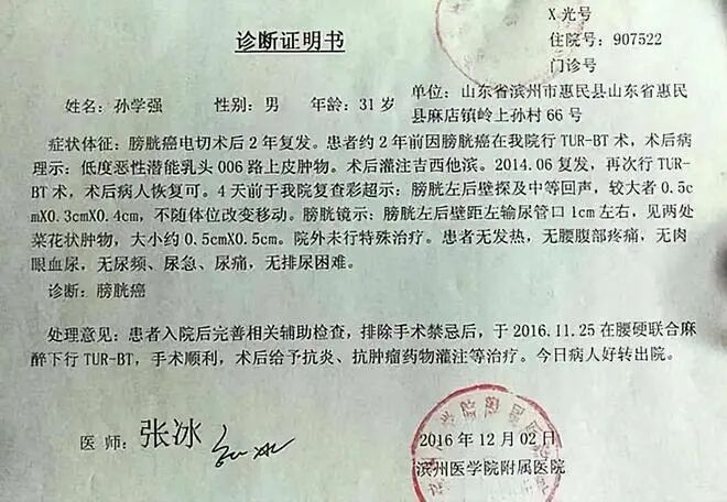 2014年3月,正常大小便已经受到疾病影响的孙学强,被检查出患上了膀胱癌。