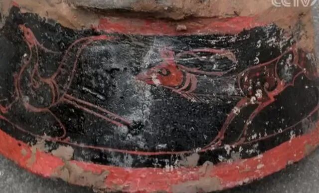 很快,考古人员发现了墓主人的一些陪葬品,是一些漆器彩绘陶片。